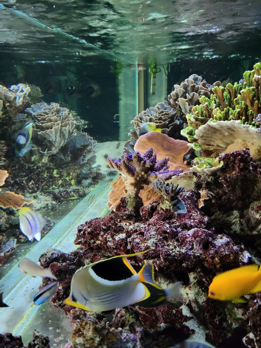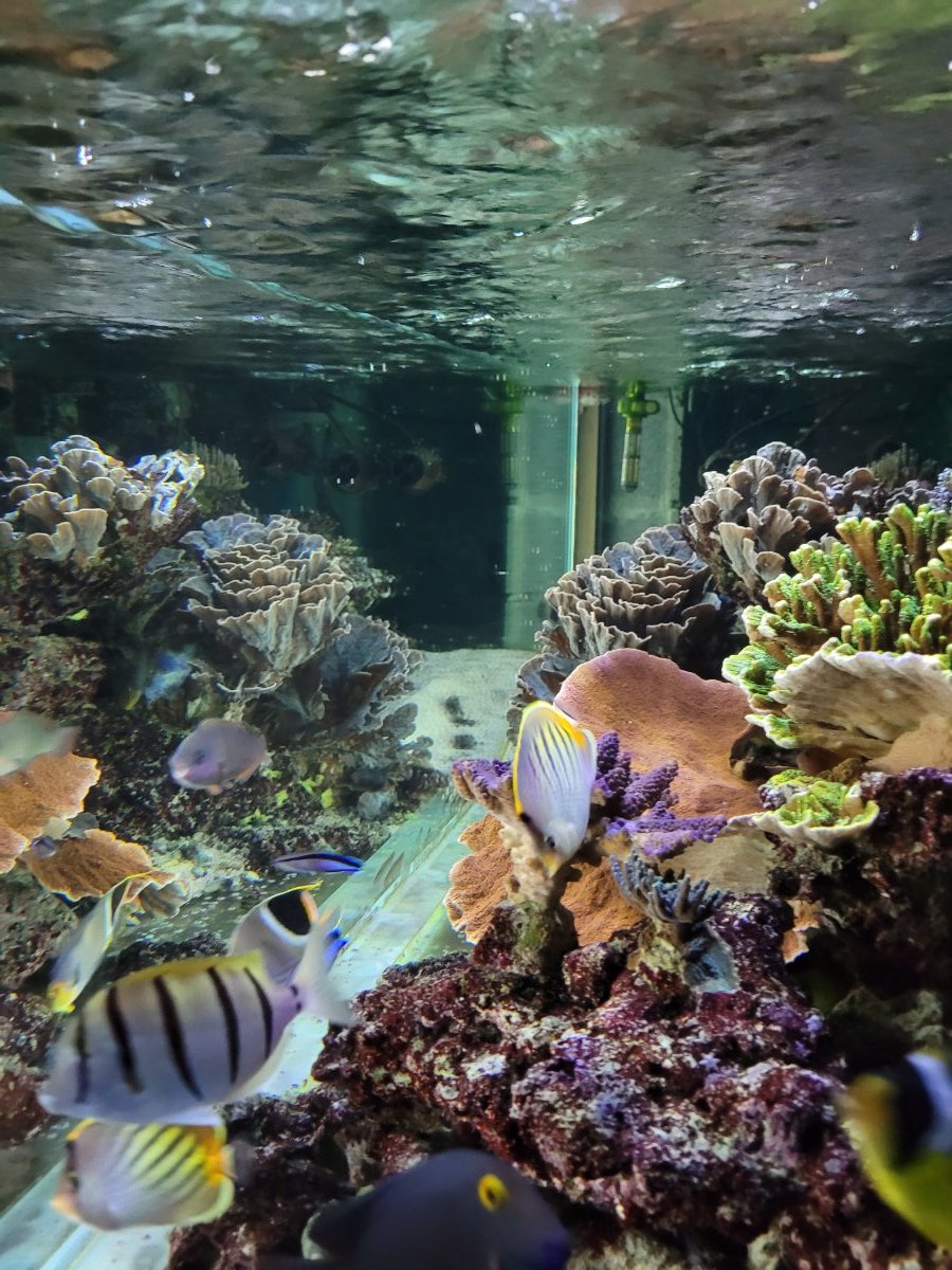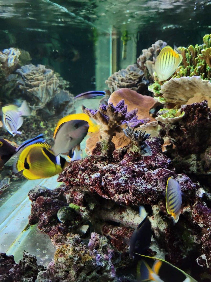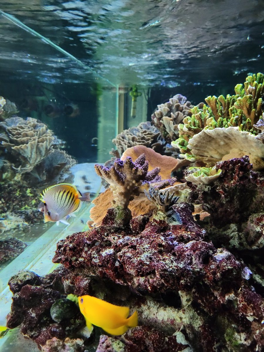 Evidemment avec la population à écailles et leur alimentation les paramètres ont dévié vers des valeurs peu orthodoxes (le checker PO4 ULR est bloqué à 0,9... 🤭). Il faut dire que j'ai aussi quelque peu relâché le suivi pendant un an. Mais j'arrive après pas loin de 3 ans et demi à entrevoir le "but final" : de beaux poissons en forme, de familles variées, certains en paires (couples ou pas...) qui nagent dans une reconstitution d'un arrière récif polynésien au milieu de colonies coralliennes peu nombreuses mais bien établies. Et finalement voir le Chaetodon lunula ou le pelewensis picorer de temps en temps les Montipora et Echinopora ne m'horrifie pas, au contraire : ils mangent "au naturel".