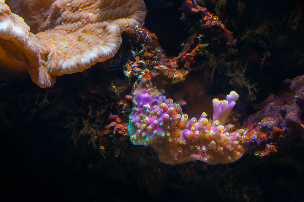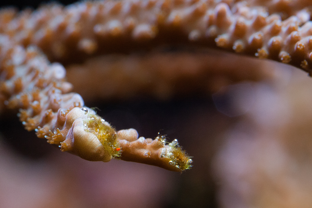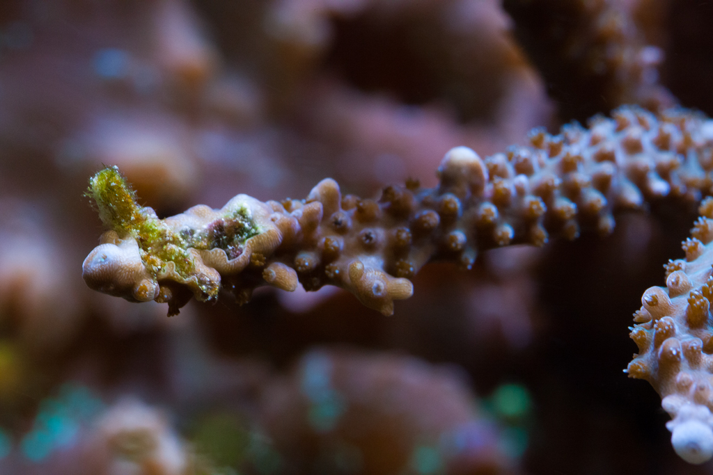 Les couleurs des autres Accropora semblent s’orienter vers leurs couleurs d’origine. Le Seriatopora histrix ne change pas de teinte, il reste rose/beige, mais les pousses me semblent plus pointues. Le Montipora vert/rose qui avait pâli reste blanc, et 80% de sa surface se colonise d’algues. Je pense qu’il est cuit, mais de nombreux fragments semblent stabilisés chez Cyril et une belle bouture avait été protégée avant que cela aille trop mal.