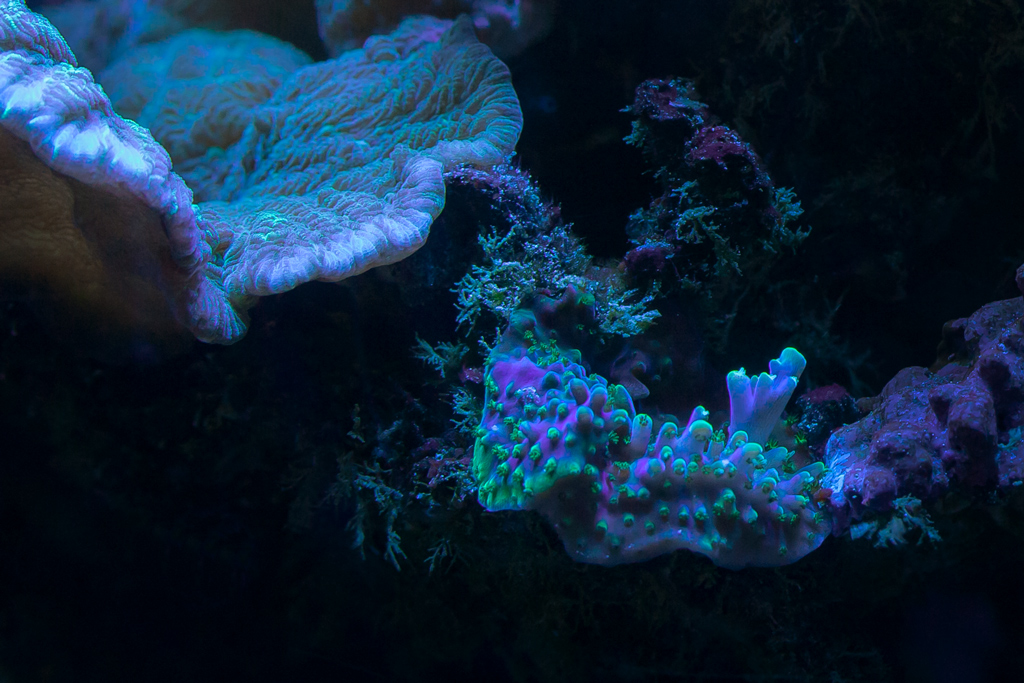 Comble du récifaliste, un corail que je maintenais depuis au moins 8 ans à l’état de bouture rabougrie et marronnasse sans polypes avec moignons gris s’est transformé en quelques semaines en ceci.